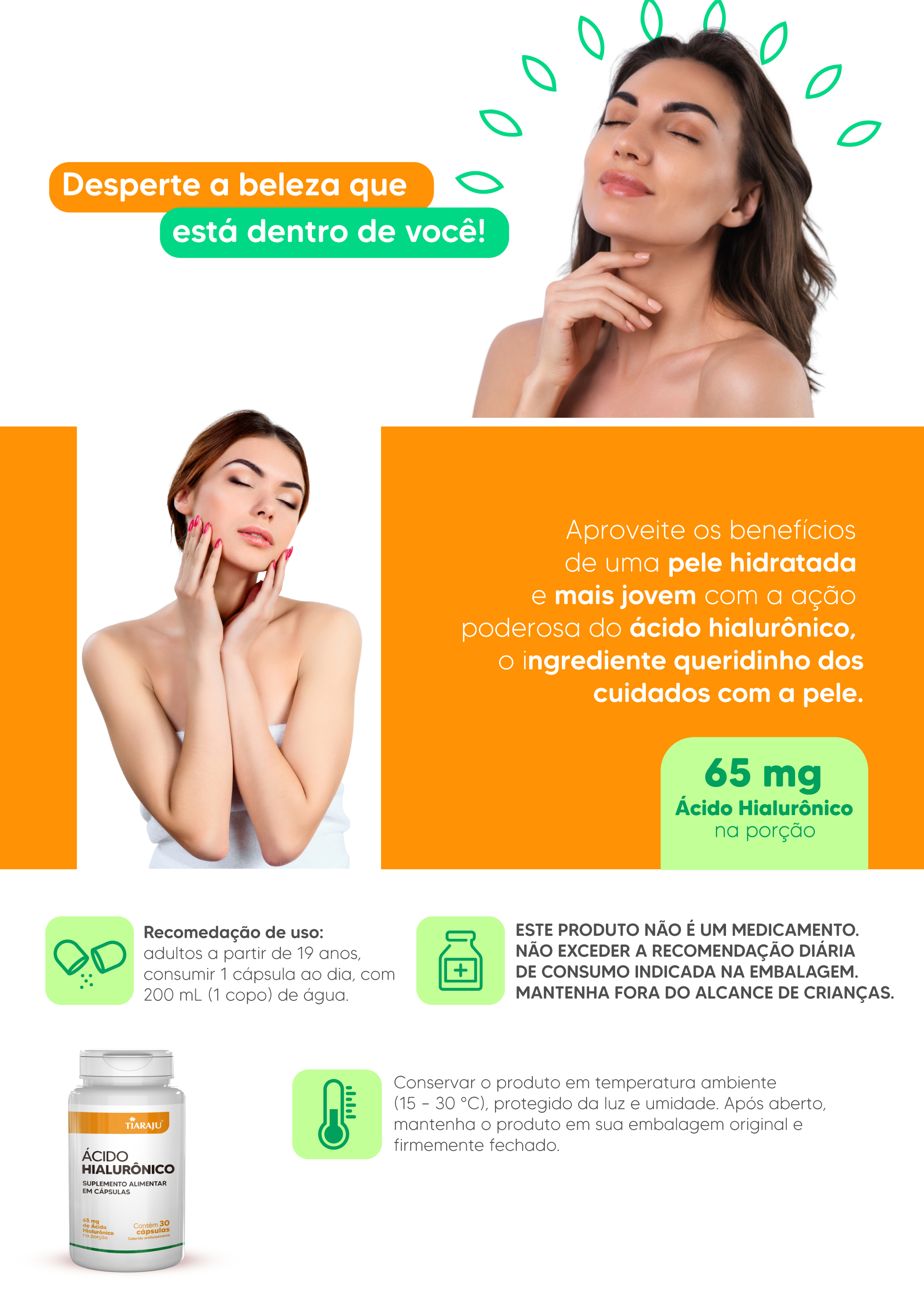 O Ácido Hialurônico é um suplemento alimentar que pode ser utilizado por pessoas que desejam melhorar a saúde e aparência da pele. Segundo estudos ele mantém vivas as fibras de colágeno que dão sustentação, hidratação e também elasticidade à pele, pois conforme envelhecemos a produção desse ácido vai diminuindo gradativamente.