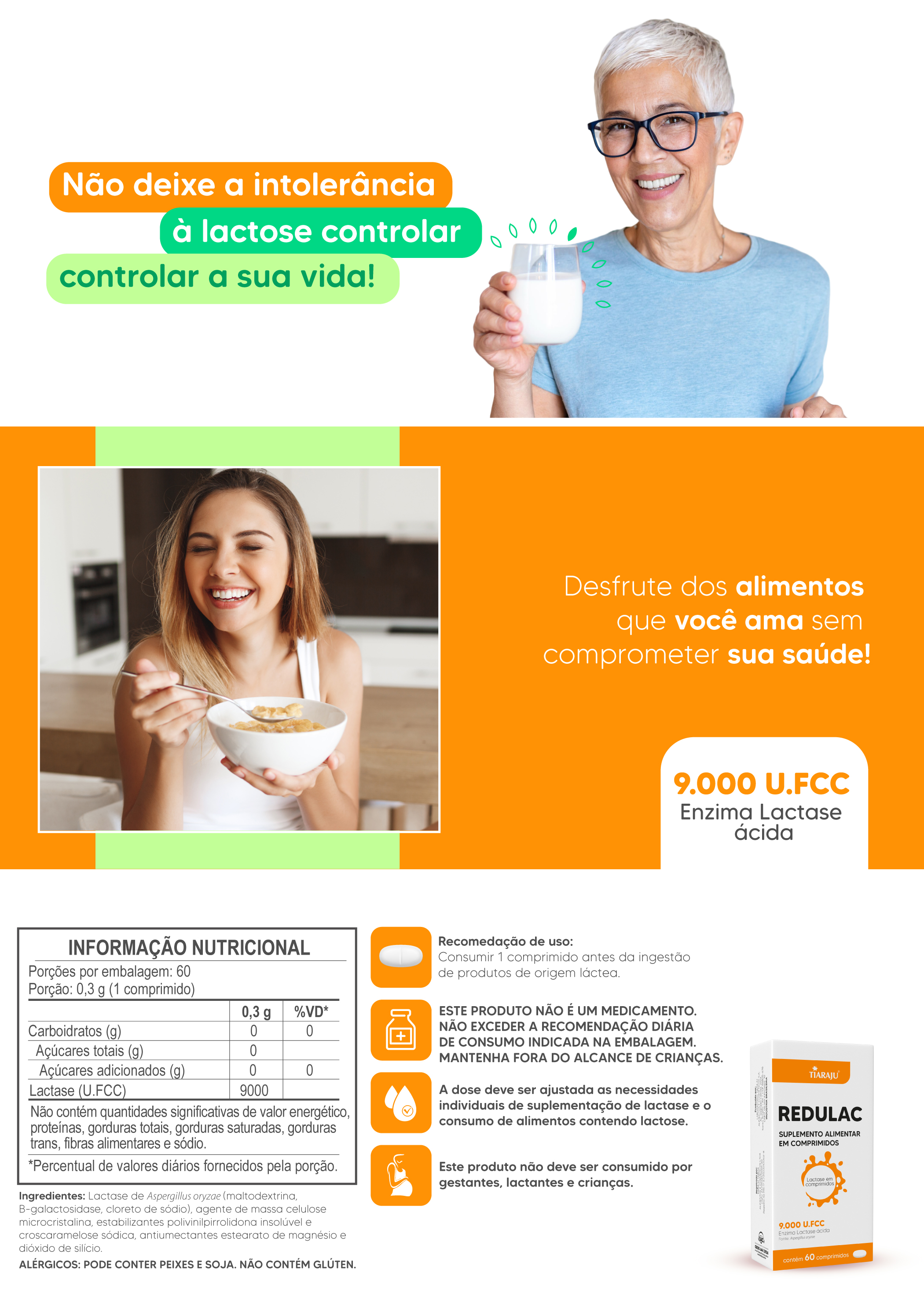 Recomendação de uso: Adultos a partir de 19 anos, consumir 1 comprimido antes da ingestão de produtos de origem láctea.